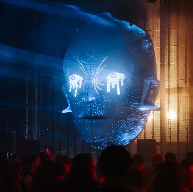 The idea of creating the head in 2014 came from the movie 'Metropolis'. There was an androgyne — a woman and a man, a human, and a robot simultaneously. We chose this image because a club is, first and foremost, about the faces and people that surround you and make your rave brighter. The original installation didn't survive, but we recreated the five-meter head from old drawings and added new technologies.