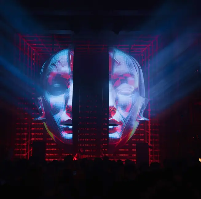 We used neural networks to project party guests' faces onto this head. Behind it was a transparent LED mesh with lighting fixtures hidden underneath. They worked as a powerful piercing grid across the entire auditorium area. When the matryoshka head split into two halves and moved left and right on the rails, the lasers inside stretched like gum. Our partners SETUP were responsible for them and the whole lighting setup.