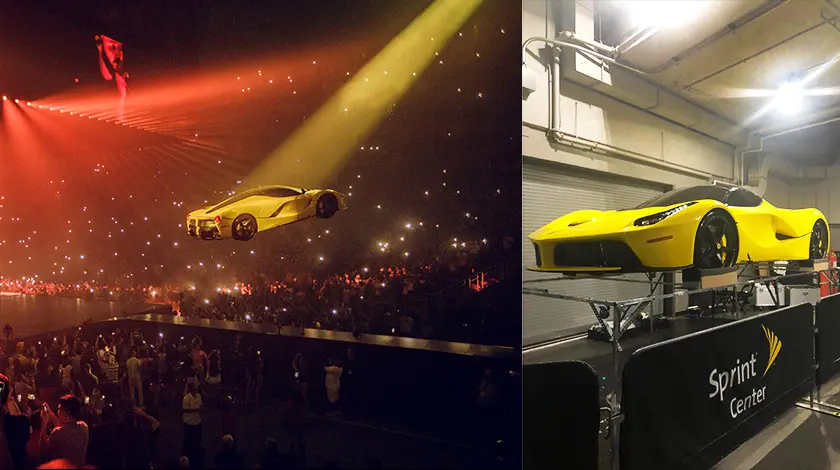 The show used a lot of visual effects. Among them were lasers, CO2 effects, a flying Ferrari, and 200 flying drones that created volumetric figures above the artist.
