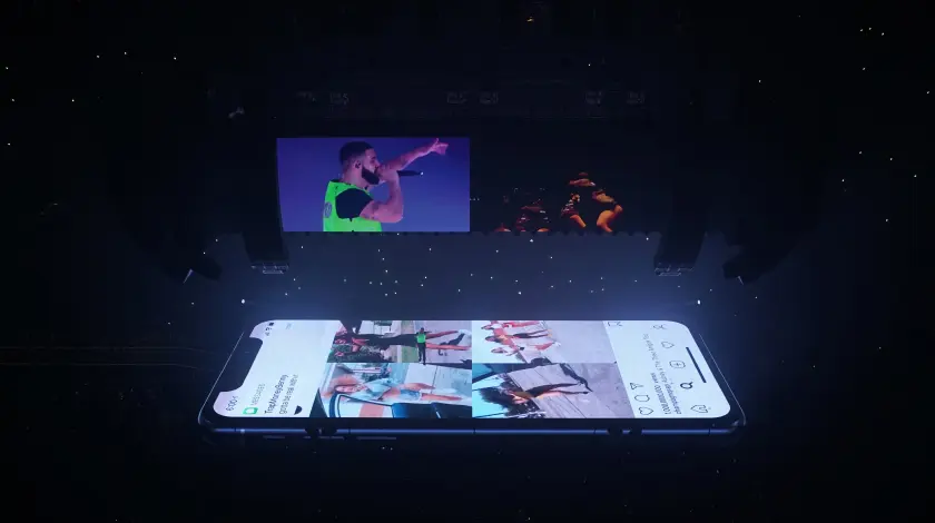 Our main task was to create a visual design for Drake's tracks using all the sorts of 3D visuals. We worked on the project for three months, creating a huge, stage-sized scorpion, multi-colored palm trees, an iPhone X home screen, the performer’s holographic projection, a basketball court, and photorealistic volumetric lava to share the stage with Drake.
