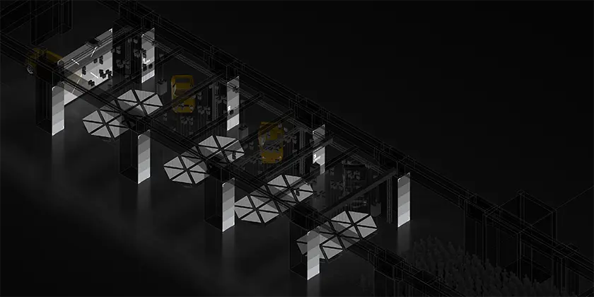 The perspective and the viewing angle were taken into account when creating video content so that all the involved surfaces – kinetic arrays, rows of concrete columns and a screen on the background – formed a striking conjoint picture for the viewer.