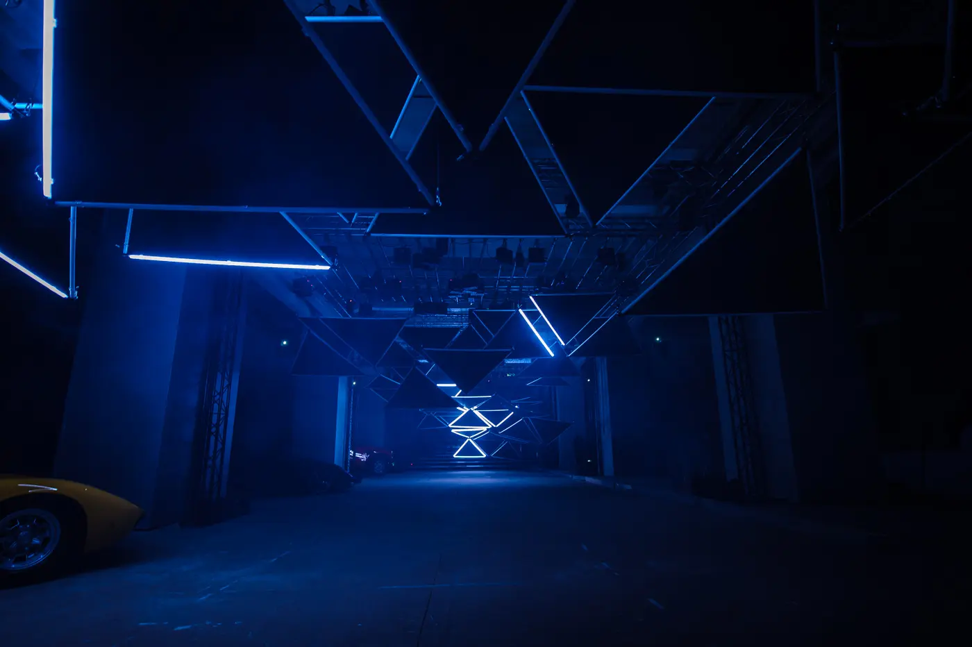 The main part of the setup is 56 triangles with LEDs around the perimeter (the total length of the LED strip is almost 900 feet), suspended on 168 kinetic winches. Separately and all together, they served as canvases for the large-scale projection show in combination with the background screens. There were 14 projectors used, including the most modern ones with the brightness level of 30,000 lumens and a 4K resolution.