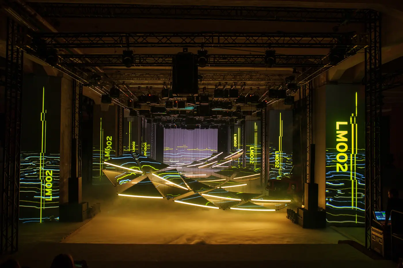 It was the first time when we worked with a 3D projection on volumetric arrays controlled by kinetic winches. The main technological innovation of the show was a specially developed software algorithm that calculated the movement of all 56 light triangles: for this purpose, we used data obtained directly from the design software.