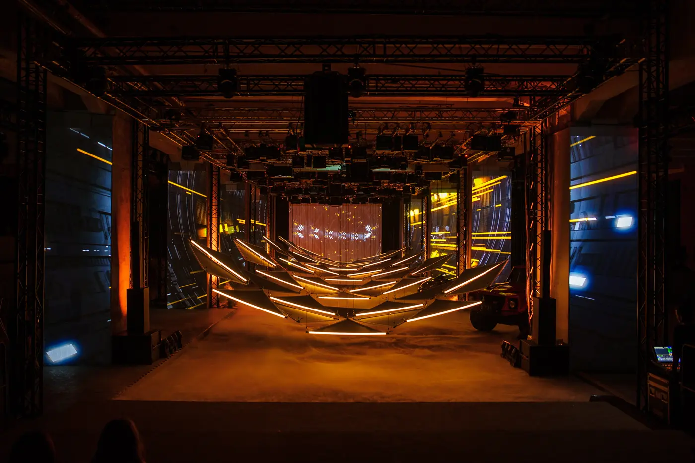 During the show, each of the elements from the array of LED triangles independently moved in space forming polygonal three-dimensional figures for projection mapping. The technological concept of the show was fully developed and implemented by Sila Sveta experts. The show was controlled with the Disguise 4x4pro and TouchDesigner multimedia servers running specially developed software.