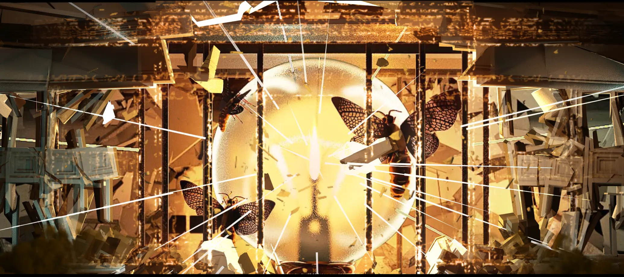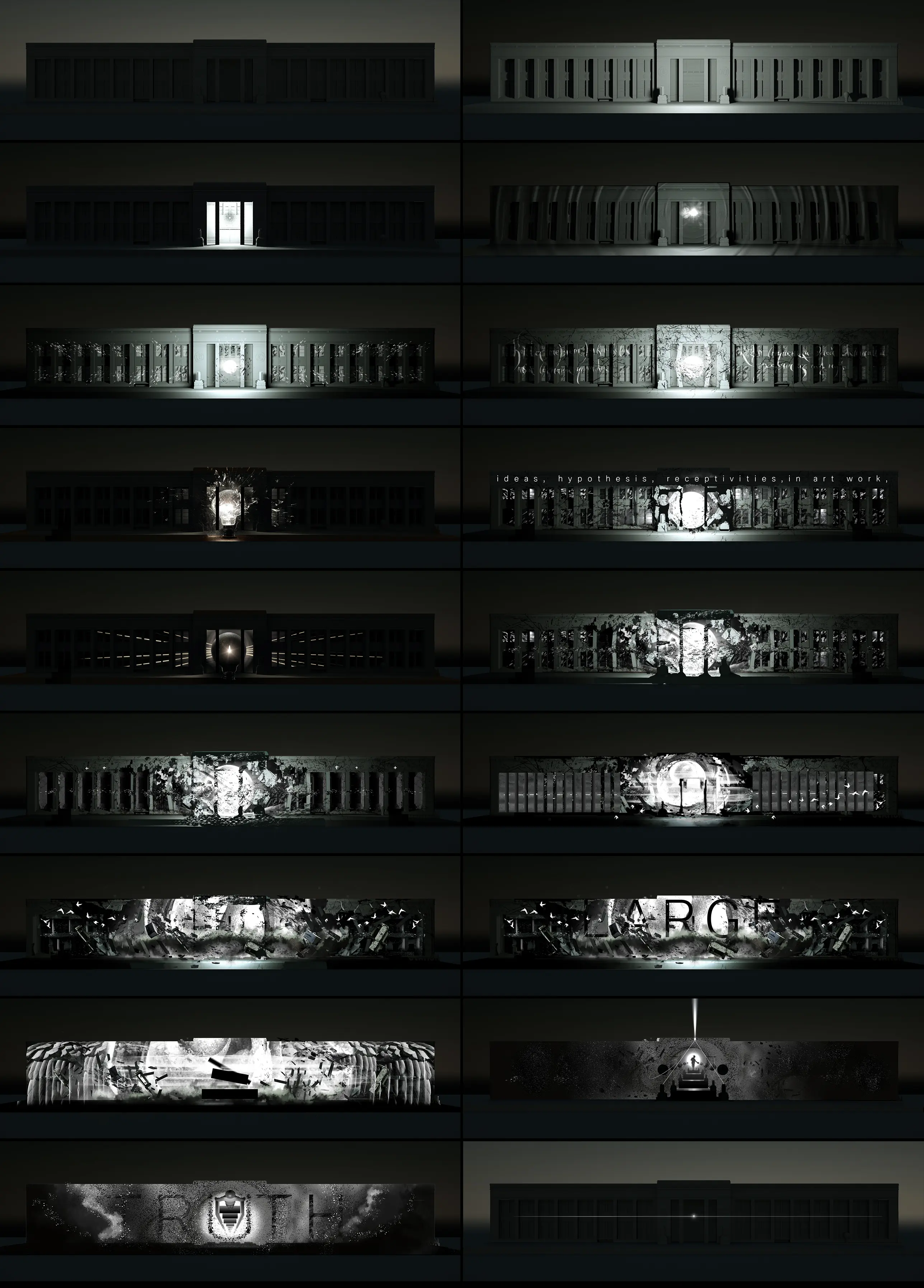 The moment of the eruption is extended to 3 minutes in slow motion. According to the idea of the Art Director of the project Ilya Balakin, the explosion alternates with "flashbacks" – the small plots that intersect with the text of the poem read by Yuri Kolokolnikov. These flashbacks are inscribed in the collapsing geometry of the building, which is under unique phase of destruction every second.