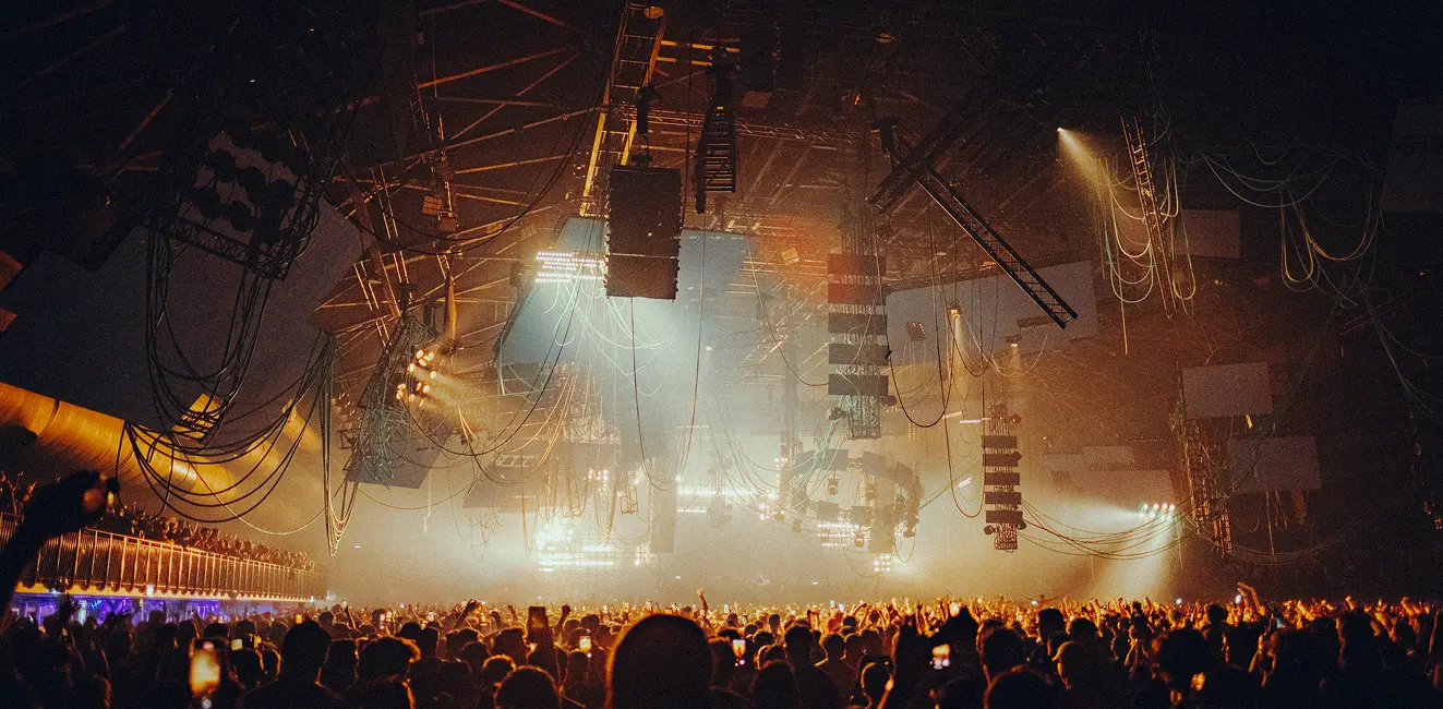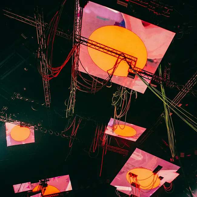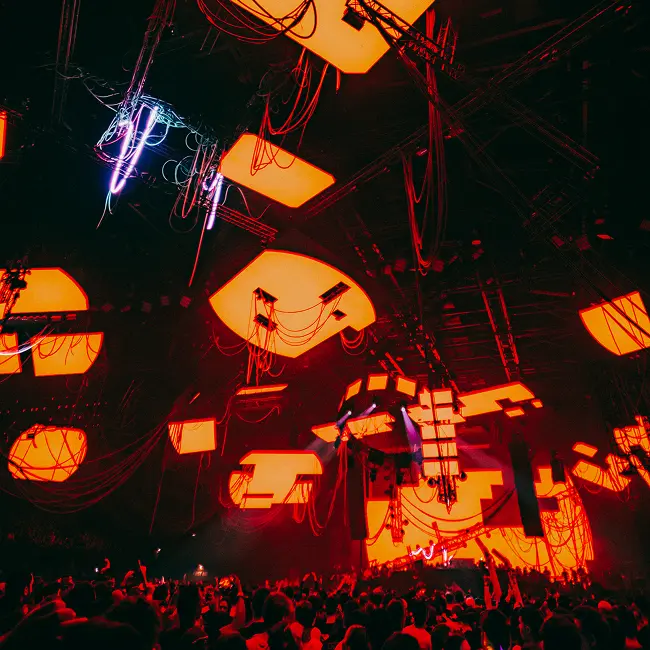 Visually, the structure echoes the venue’s industrial architecture. The interplay of broken surfaces and searing light turned the stage into a controlled explosion—a physical expression of digital deconstruction.